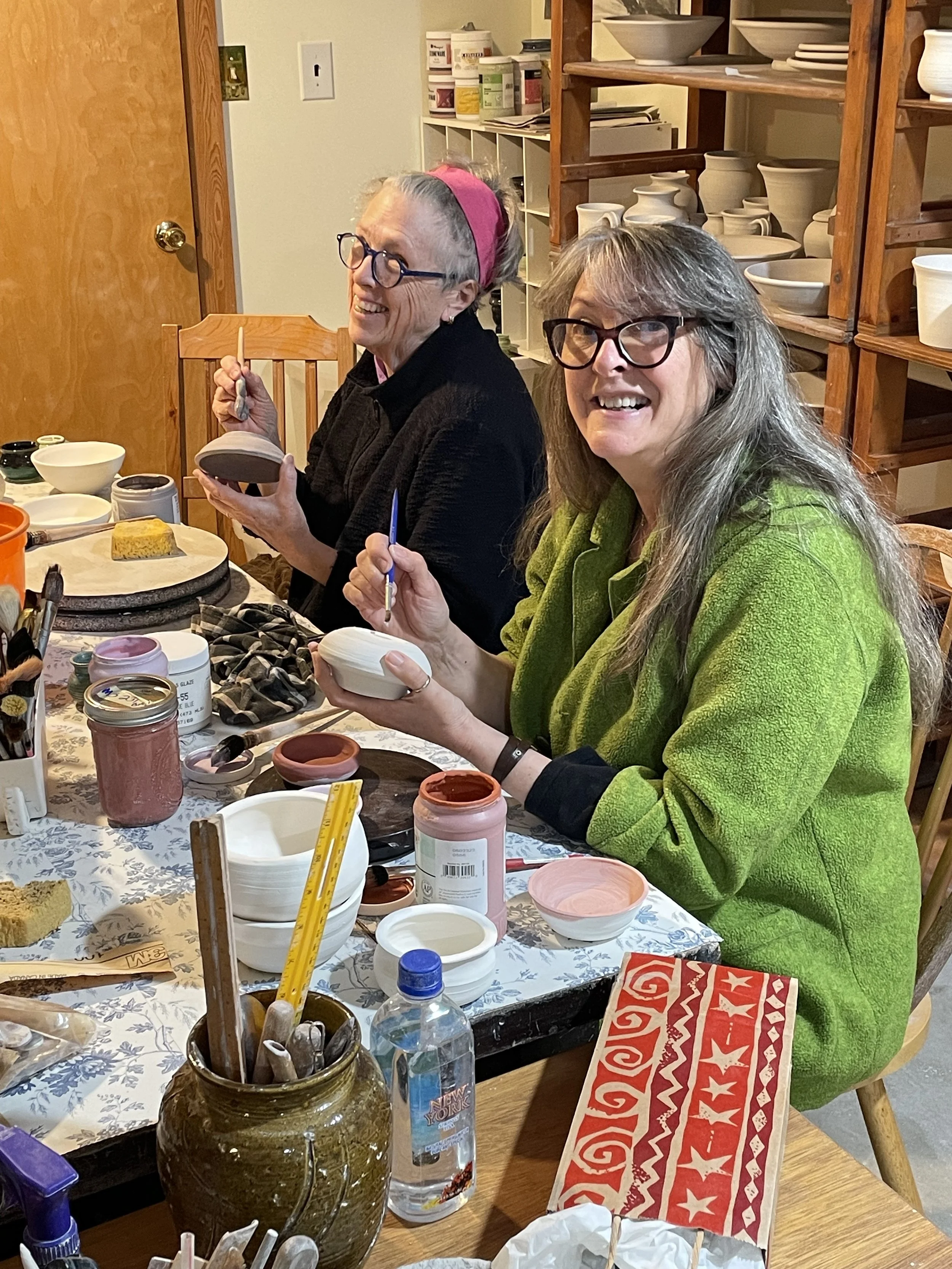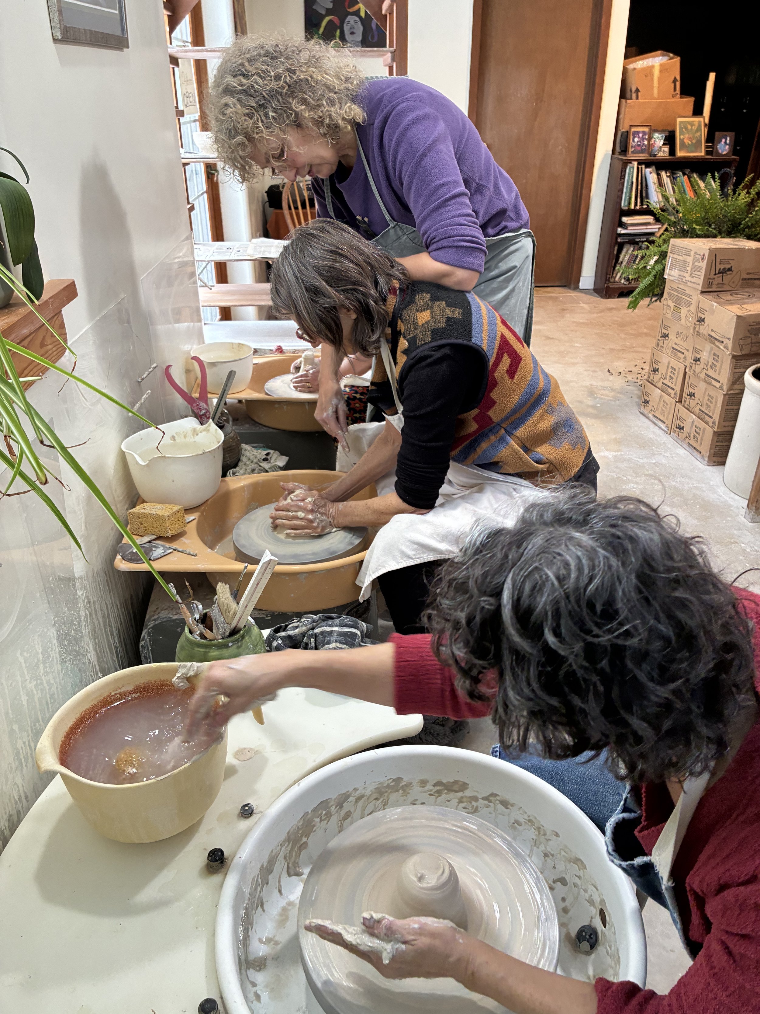 “I wasn't sure what to expect when 3 friends and I signed up to take a series of pottery classes from Liz Lawrence. We were all amazed and completely satisfied not only with our clay creations, but with the grand time that we had! Liz was able to pace the projects so we moved from creating the simplest pinch pots, to slab projects to actually successfully making beautiful bowls on the wheel. Her clear instructions and gentle guidance enabled us to not only feel comfortable and confident, but to also have a really good time with great conversations, smiles and laughter. I envied Liz's ability to help all four of us simultaneously.